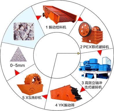 首先,石料由粗碎機進(jìn)行初步破碎,然后,產(chǎn)成的粗料由膠帶輸送機輸送至細(xì)碎機進(jìn)行進(jìn)一步破碎,細(xì)碎后的石料進(jìn)振動篩篩分出兩種石子,滿足制砂機進(jìn)料粒度的石子進(jìn)制砂機制砂,另一部分返料進(jìn)細(xì)破。進(jìn)制砂機的石子一部分制成砂,經(jīng)洗砂機(可選)清洗后制成成品砂,另一部分進(jìn)制砂機再次破碎。